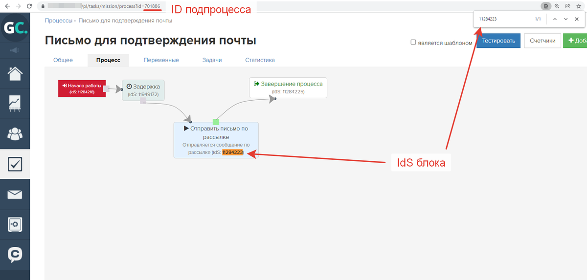 В колонке «Подпроцесс» указывается ID подпроцесса, в рамках которого выполнялся заданный блок.