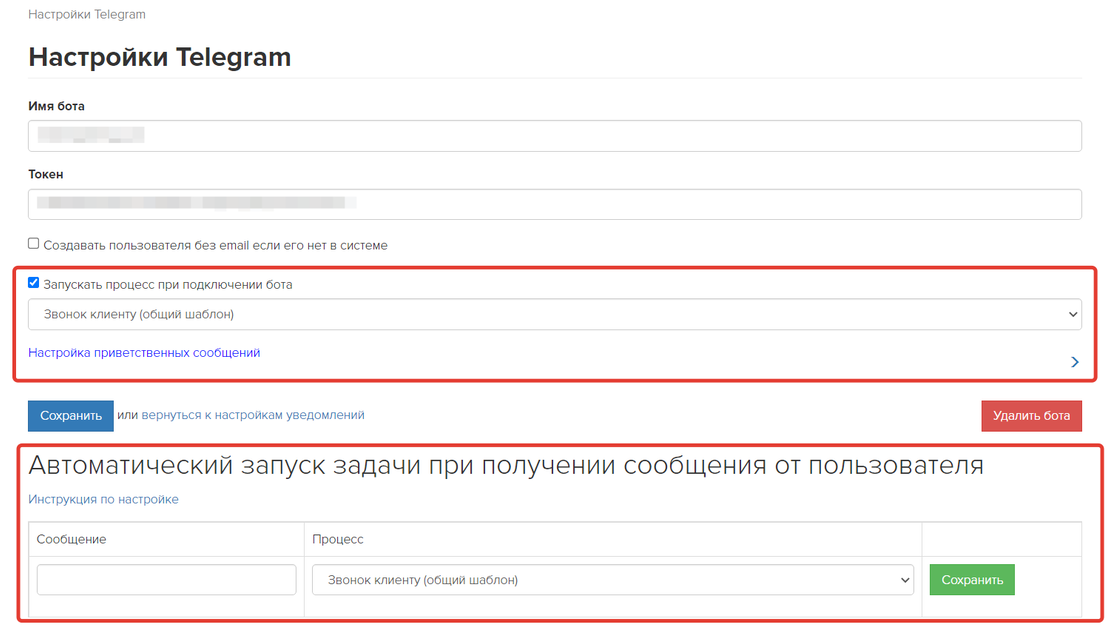 - при подключении Telegram-бота либо при получении сообщения от пользователя, в котором содержится ключевое слово;
