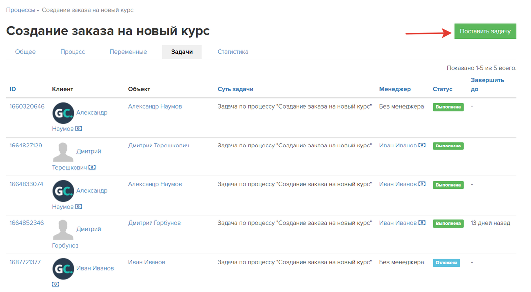 На вкладке «Задачи» Чтобы добавить новую задачу, нажмите кнопку «Поставить задачу» (3).