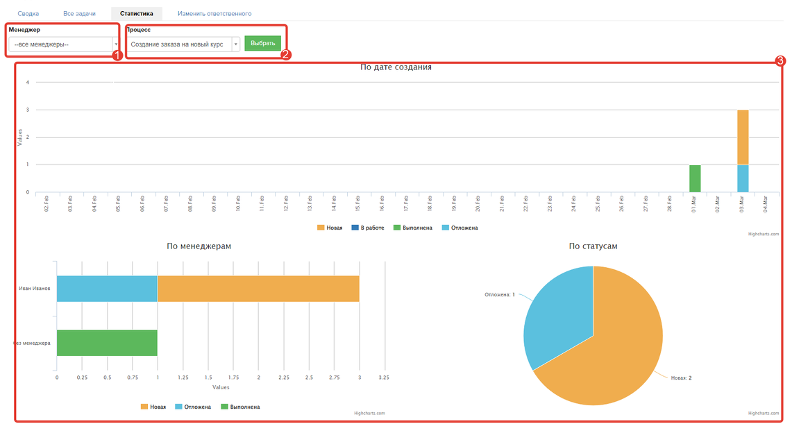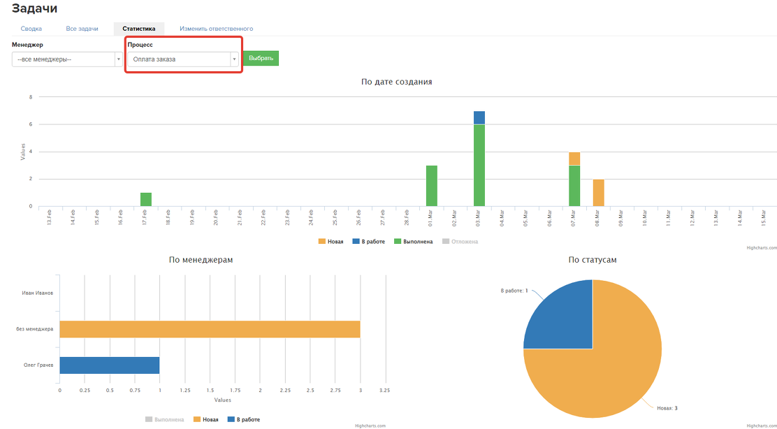 В данном разделе можно отфильтровать задачи по конкретному менеджеру или процессу (рис.2), а также просмотреть статистику задач, распределённую по дате создания, менеджеру и текущему статусу.