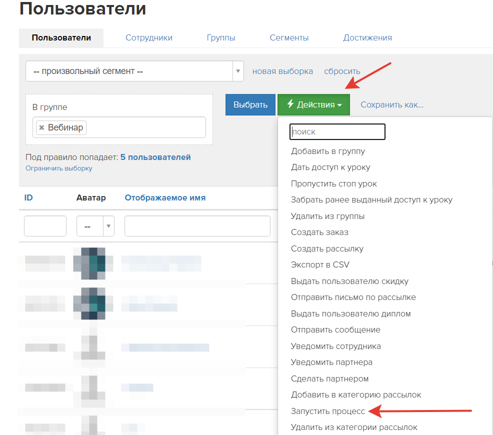 - Массовое действие осуществляется через кнопку «Действия — Запустить процесс» в разделе «Пользователи».