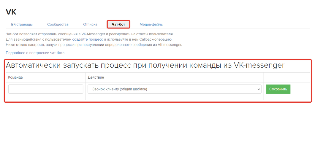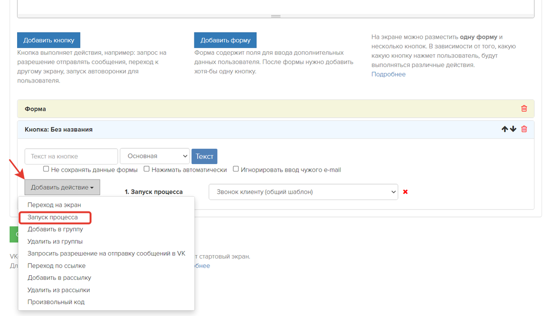 - при отправке формы на странице ВКонтакте посредством действия «Запустить процесс».