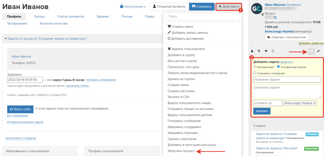 Задача может выполняться автоматически или требовать вмешательства сотрудников-менеджеров. Например, менеджер должен принять задачу в работу и позвонить клиенту.