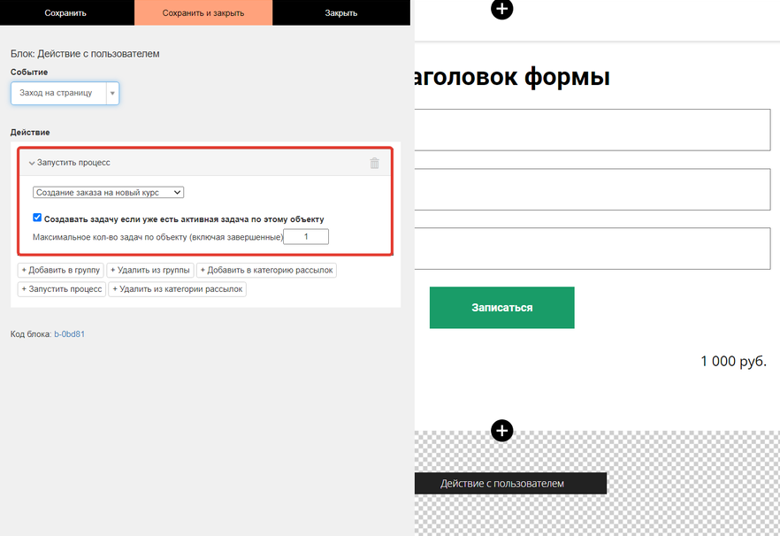 - при переходе на страницу, содержащую блок «Действие с пользователем»