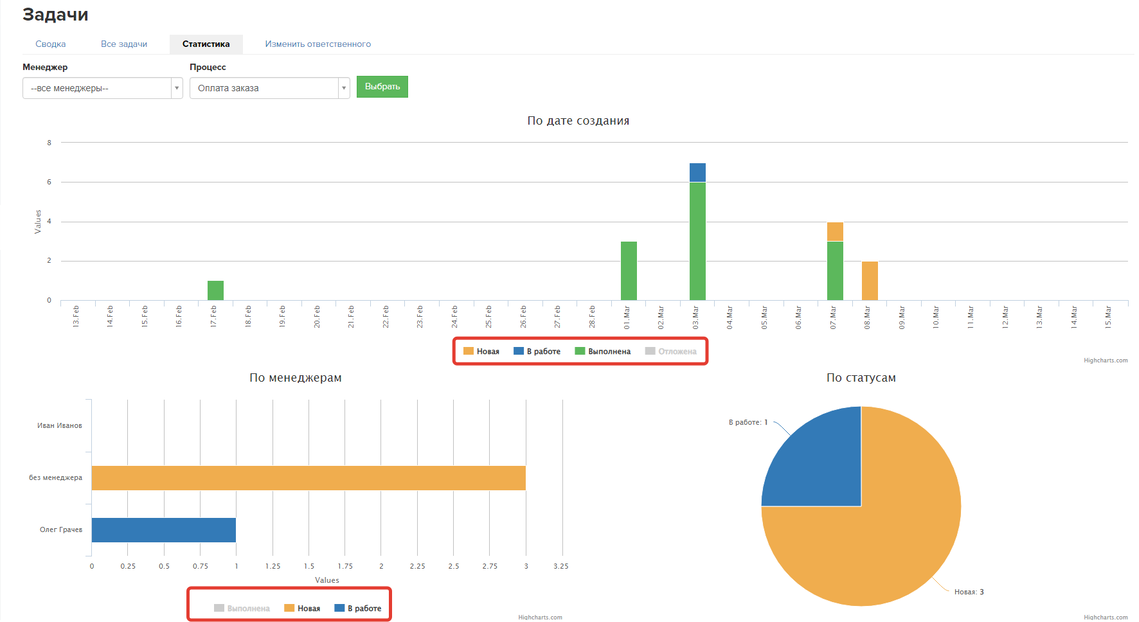 - Статистика — информация по задачам процесса, разбитая по менеджеру, дате создания и текущему статусу.