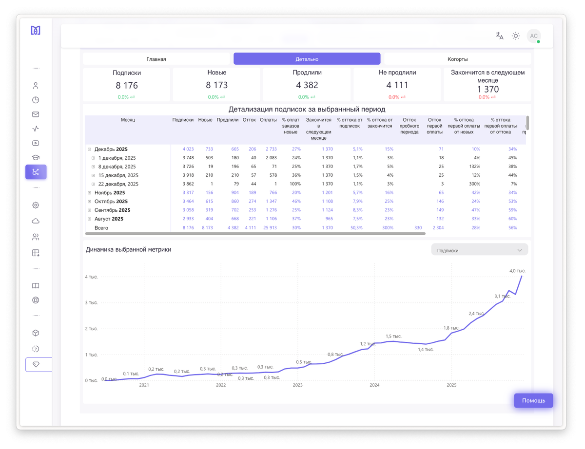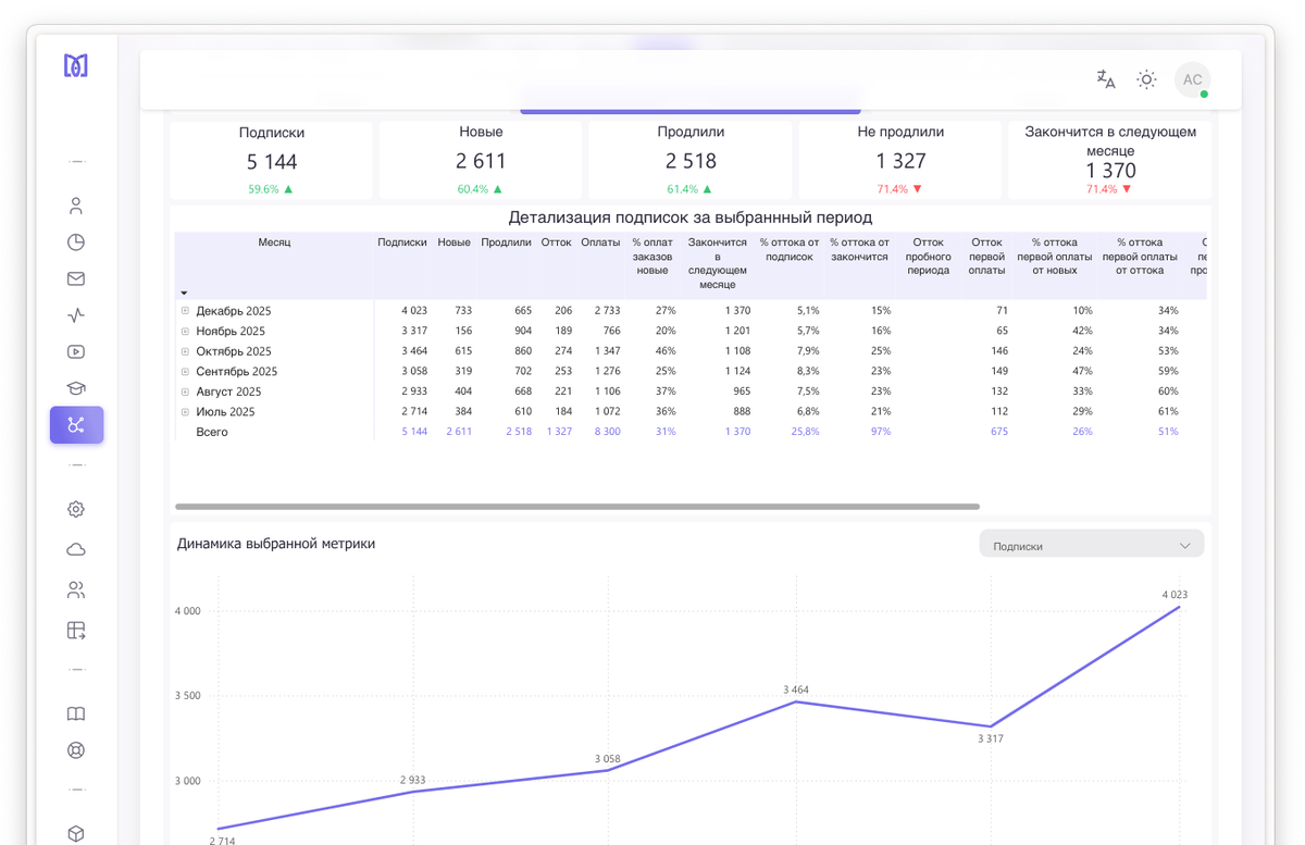 - Метрики. Количество подписанных (учитываются все, кто был активен хотя бы один день в периоде), новых, продливших, не продливших и тех, чья подписка заканчивается в следующем месяце.