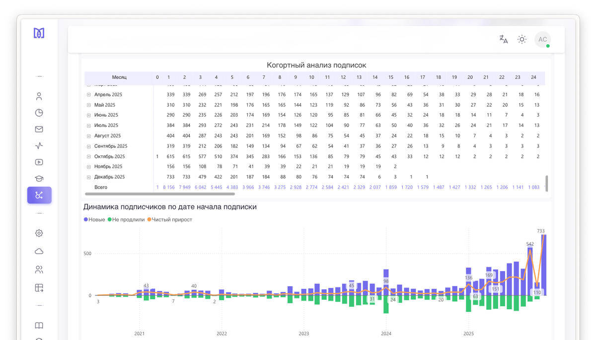 - График динамики подписчиков. Когортный, по дням начала. Показывает новых и не продливших (данные обновляются задним числом). Чистый прирост — сколько активных осталось в когорте. Помогает оценить «живучесть» групп пользователей.