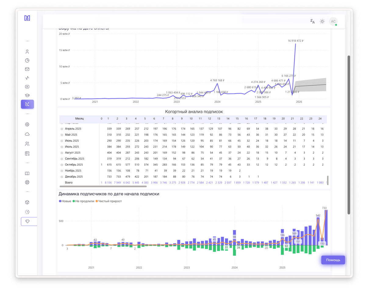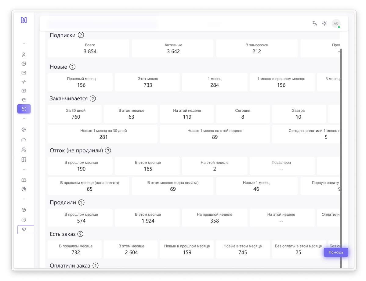 В отличие от базовых инструментов аналитики, здесь акцент на текущей ситуации и исторических трендах. Вы можете быстро оценить, сколько активных подписчиков сейчас, сколько новых присоединилось, кто уходит и почему. Это позволяет оперативно реагировать: например, отправлять напоминания о заканчивающихся подписках или анализировать причины оттока. В итоге, модуль помогает оптимизировать маркетинг, улучшать удержание и прогнозировать доходы, что критично для устойчивого роста бизнеса.