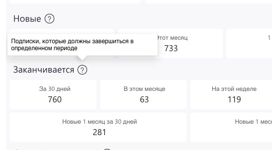 - Заканчивается. Количество подписок, которые вот-вот истекут. Идеально для интеграции с отделом продаж — можно отправить напоминания, чтобы минимизировать отток.