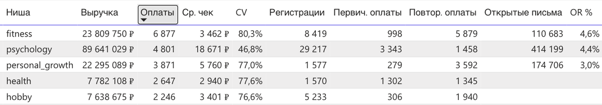 Лидер — fitness с 6 877 оплатами, хотя выручка у него меньше, чем у psychology (23,8 млн ₽ против 89,6 млн ₽).