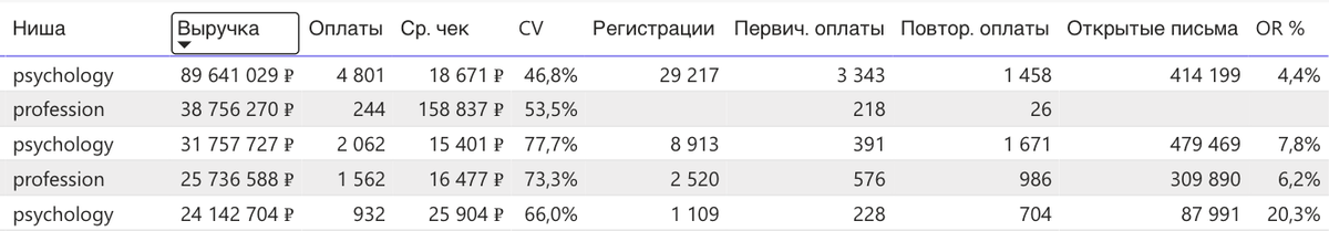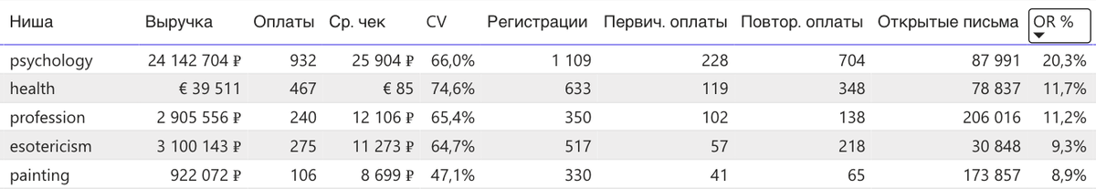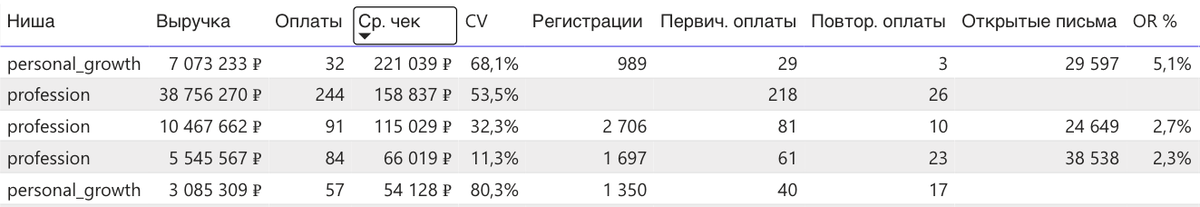 OR% здесь заметно выше, чем в массовых нишах: например, personal_growth с чеком 221 тыс ₽ имеет OR = 5,1%.