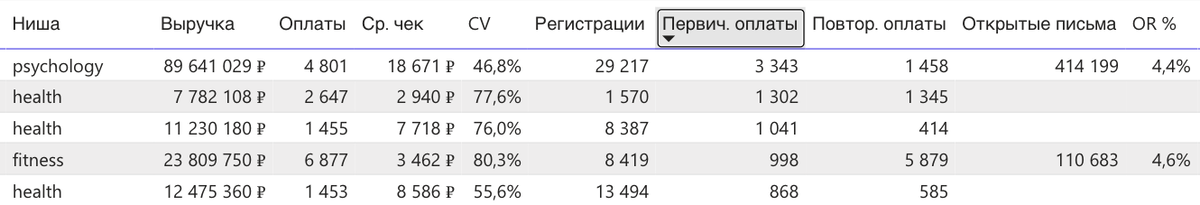 Лидер — psychology с 3 343 первичными оплатами, сильно обгоняя остальные ниши.