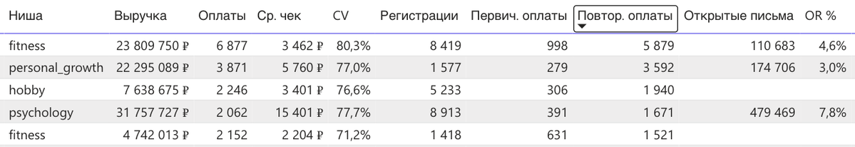Однако важно понимать: выручка сама по себе не отражает качество процессов. В таблице видно, что проекты с меньшей выручкой могут выигрывать по конверсии, повторным продажам или вовлечённости базы.